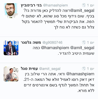 5. בשלב זה מצטרפים לחגיגה ידידיו העיתונאים של הדובר המשפיע והמתקפה החלה. משה גלסנר - מגיד המהדורה המרכזית ברדיו קול ברמה מגיב: כמה שעמית היטיב להגדיר.. עמית סגל שב ותוקף ובציניות השמורה רק לו מגחך על רבינוביץ, וכותב לו: אתה הרי שילוב של ז'אק רוסו (פילוסוף צרפתי שהשפיע על המהפיכה בצרפת) ואמיל זולא (סופר ופובליציסט צרפתי דגול).