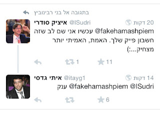 לפניכם תגובותו של דובר תנועת ש"ס בבחירות האחרונות, מר איציק סודרי, כשקלט לפתע כי בני רבינוביץ עימו הוא מתעמת, הוא חשובן הפייק של הדובר - המשפיע - צייצן כיום, ומה הגיב על כך איתי גדסי?
