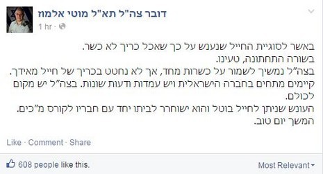 דובר צה"ל תא"ל מוטי אלמוז פרסמם קודם לכן פוסט בפייסבוק בו כתב: "באשר לסוגיית החייל שנענש על כך שאכל כריך לא כשר. בשורה התחתונה, טעינו. בצה״ל נמשיך לשמור על כשרות מחד, אך לא נחטט בכריך של חייל מאידך. קיימים מתחים בחברה הישראלית ויש עמדות ודעות שונות. בצה״ל יש מקום לכולם. העונש שניתן לחייל בוטל והוא ישוחרר לביתו יחד עם חבריו לקורס מ״כים".