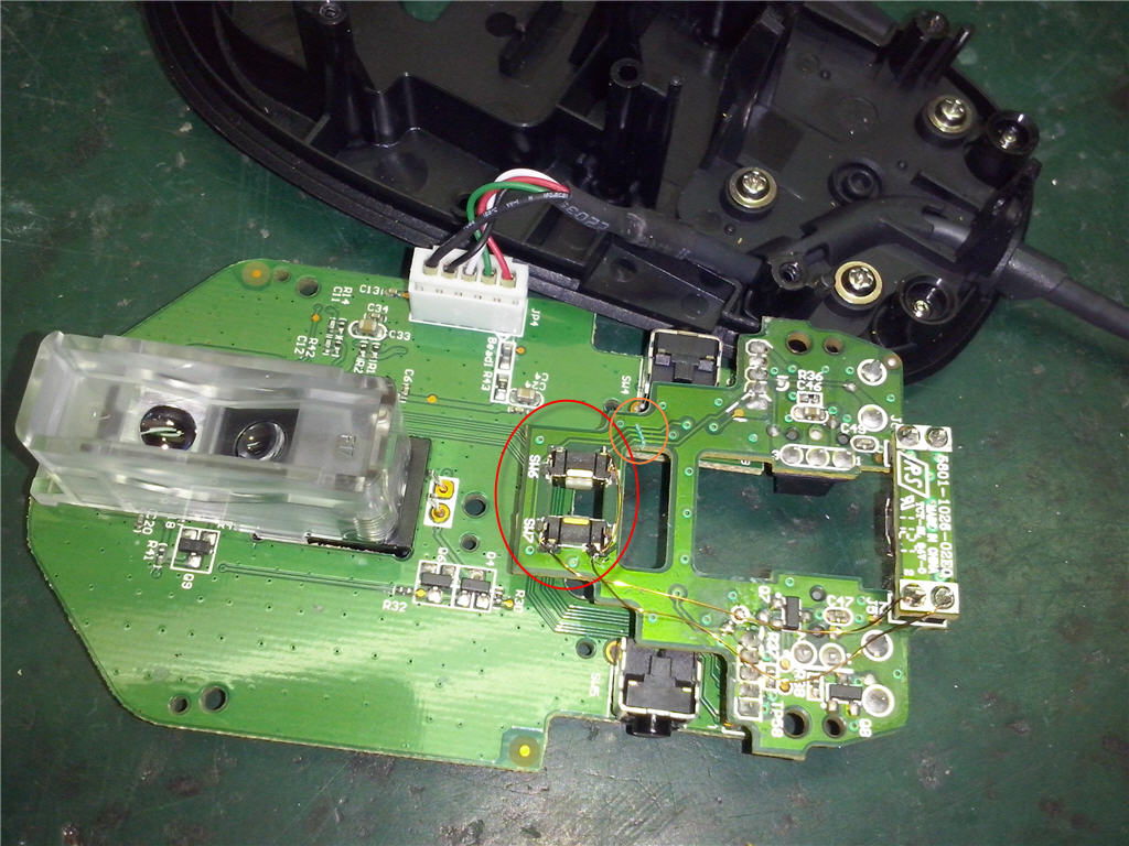 אז טוב, העכבר כבר עומד על השולחן, ומישוש קל במדבקות הסיליקון המחליקות שלו גילו לי בדיוק את מיקום שלושת הברגים (ראש טורקס, למי שמתעניין) כך שאחרי 10 שניות הוא כבר עמד פתוח. התנעתי מלחם, וחיברתי עם חוט מצופה לכה את שני הלחצנים הצידיים במקביל ללחצן האמצעי.