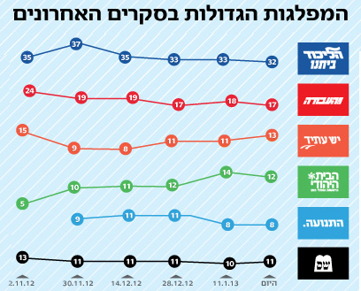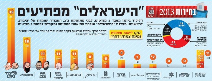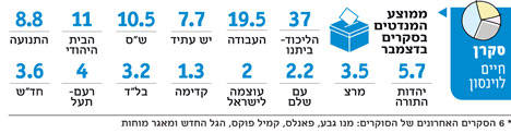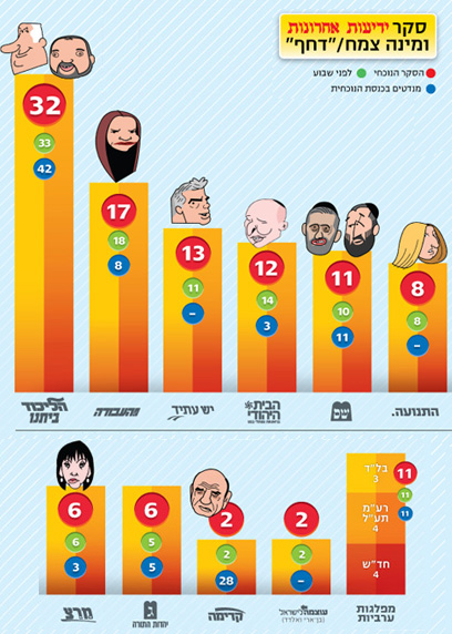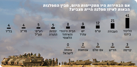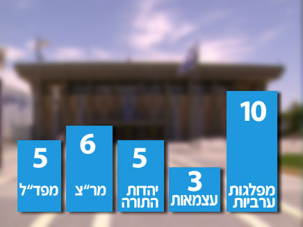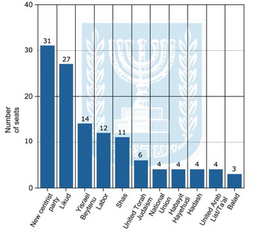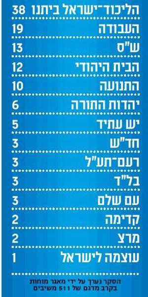 ליכוד ביתנו-34 עבודה-16 הבית היהודי-15 ש"ס-13 יהדות התורה-6 לפיד-9 ליבני-11 מר"צ-5 ערבים-11
