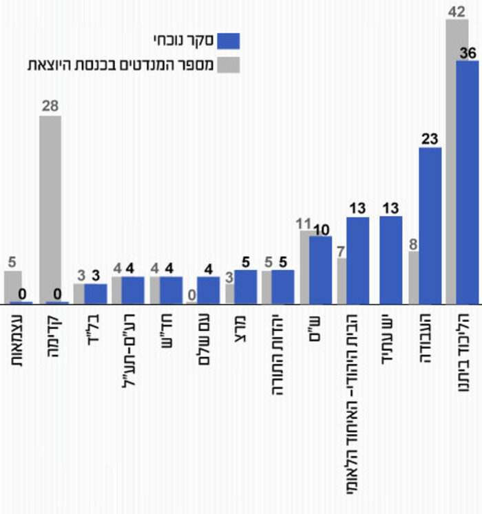 כ"ט כסלו הליכוד ביתנו - 36, העבודה - 18, הבית היהודי - 13, ש"ס - 9, התנועה - 9, יש עתיד - 7, יהדות התורה - 6, רע"ם תע"ל - 5, מר"צ - 5, חד"ש - 4, בלד 3 עוצמה לישראל - 3, עם שלם - 2. |