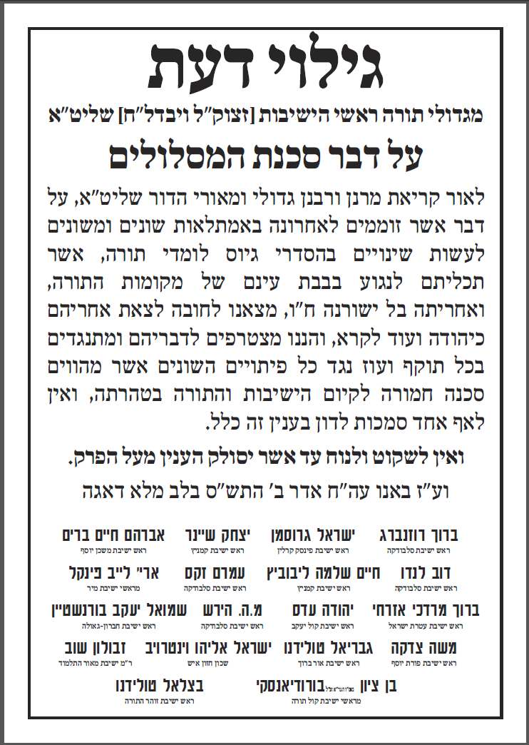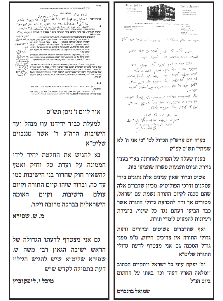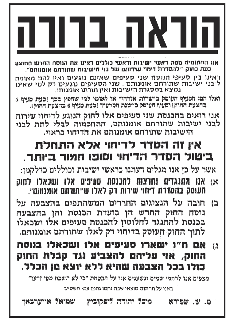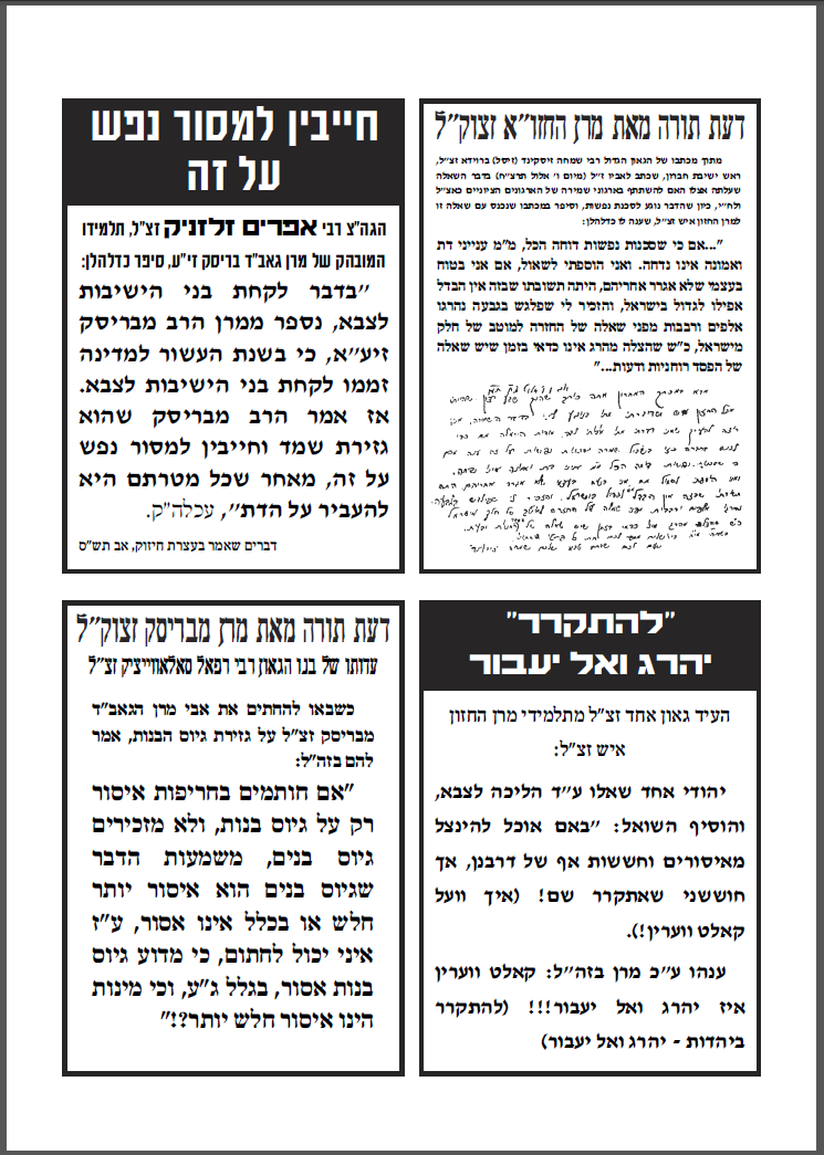 על מה היינו מוסרים את הנפש? הליכה לקבל דיחוי אין בה שום בעיה. הבעיה היא בכך שאתם פרצתם את חומת העיקשות כנגד כל מו"מ והדיברות בענין הגיוס, מה יכלנו לעשות כנגד? את הפרט הזה אתם כפיתם עלינו, ואנו סובלים מתוצאותיו עד היום הזה. זעקת 'איני מכיר'? נזעקה גם נזעקה, בעשרות מכתבי כל גדולי ישראל. הזעקה היתה שאין לנו חלק ונחלה בפשרות שלכם בחוק טל. וכי הבעיה בחוק טל היתה 'לקיחת דיחויים'? פשוט בדיחה... אתה לא מבין את גודל הגיחוך בדבריך? -------------------------- לא התפשרנו - לא נתפשר כולנו נחלצנו חושים לפעול בכל מקום ולהצביע ג' למען שלוחי ציבור אשר קיבלו על עצמם לעשות מלאכתם מלאכת שמים נאמנה לעמוד על המשמר בלי שום פשרות וויתורים וכעת הגיעה השעה לעמוד על המשמר ולהילחם בכל הגזירות בלי שום פשרות וויתורים |