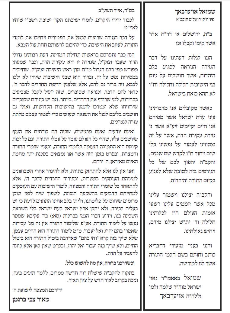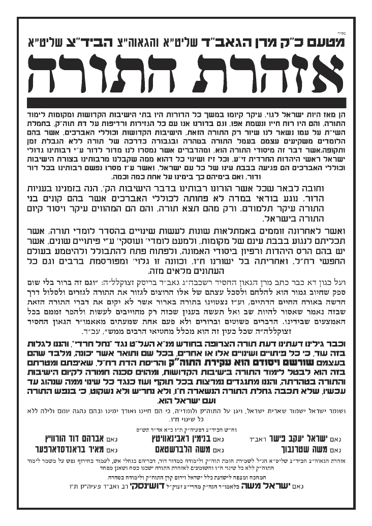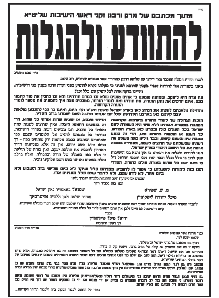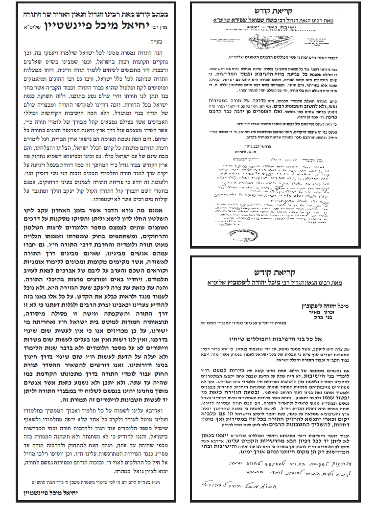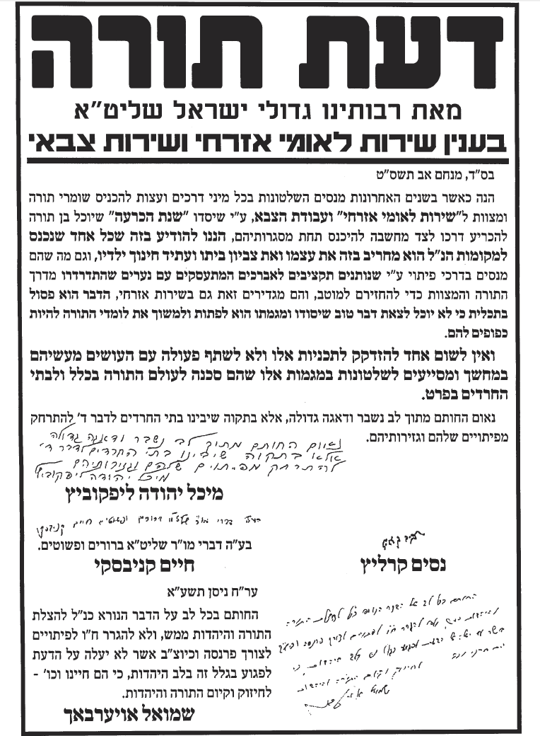 על מה היינו מוסרים את הנפש? הליכה לקבל דיחוי אין בה שום בעיה. הבעיה היא בכך שאתם פרצתם את חומת העיקשות כנגד כל מו"מ והדיברות בענין הגיוס, מה יכלנו לעשות כנגד? את הפרט הזה אתם כפיתם עלינו, ואנו סובלים מתוצאותיו עד היום הזה. זעקת 'איני מכיר'? נזעקה גם נזעקה, בעשרות מכתבי כל גדולי ישראל. הזעקה היתה שאין לנו חלק ונחלה בפשרות שלכם בחוק טל. וכי הבעיה בחוק טל היתה 'לקיחת דיחויים'? פשוט בדיחה... אתה לא מבין את גודל הגיחוך בדבריך? -------------------------- לא התפשרנו - לא נתפשר כולנו נחלצנו חושים לפעול בכל מקום ולהצביע ג' למען שלוחי ציבור אשר קיבלו על עצמם לעשות מלאכתם מלאכת שמים נאמנה לעמוד על המשמר בלי שום פשרות וויתורים וכעת הגיעה השעה לעמוד על המשמר ולהילחם בכל הגזירות בלי שום פשרות וויתורים |