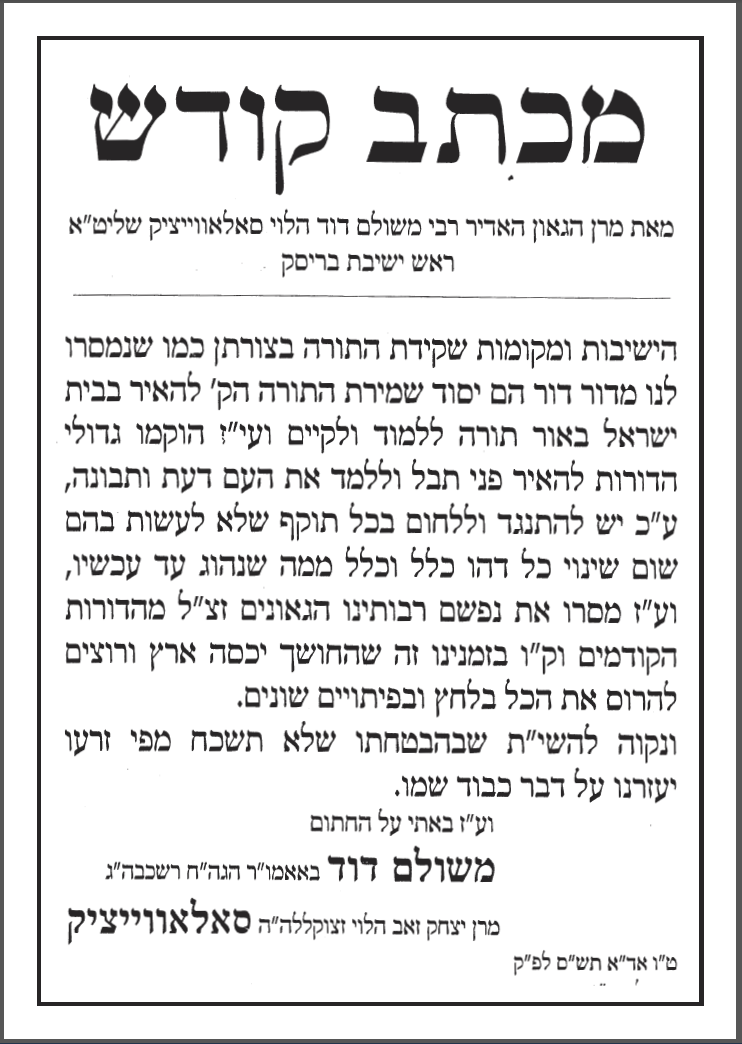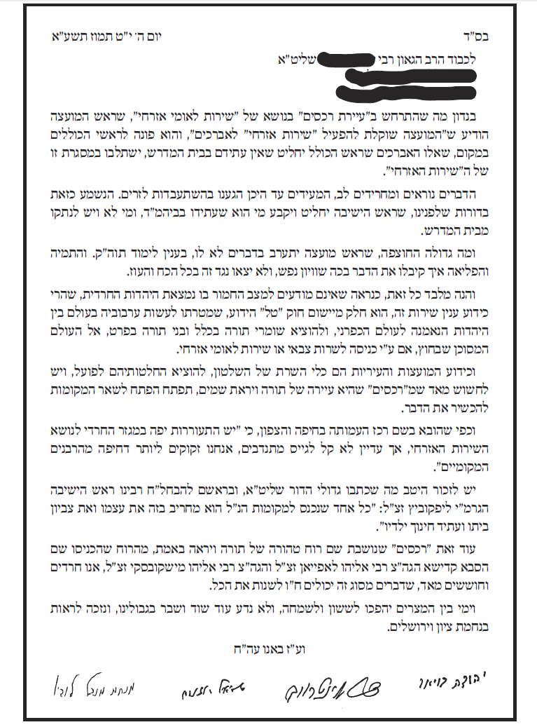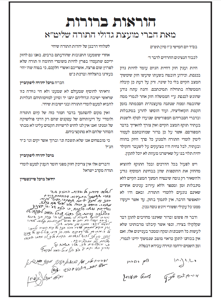 פריצת חומת העיקשות כנגד כל הידברות ומו"מ בנושא הגיוס נכפתה עלינו על ידכם. הנזקים שגרמתם השפיעו ישירות על כל הציבור. -------------------------- לא התפשרנו - לא נתפשר כולנו נחלצנו חושים לפעול בכל מקום ולהצביע ג' למען שלוחי ציבור אשר קיבלו על עצמם לעשות מלאכתם מלאכת שמים נאמנה לעמוד על המשמר בלי שום פשרות וויתורים וכעת הגיעה השעה לעמוד על המשמר ולהילחם בכל הגזירות בלי שום פשרות וויתורים |