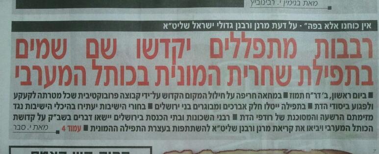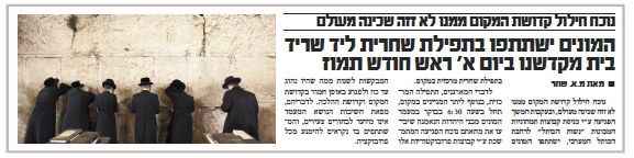 המחאה החרדית נגד נשות הכותל: גדולי ישראל אישרו הערב (ג') להורות לאברכים ברחבי הארץ להגיע ביום ראשון, ראש חודש תמוז, לעצרת תפילה ברחבת הכותל המערבי.