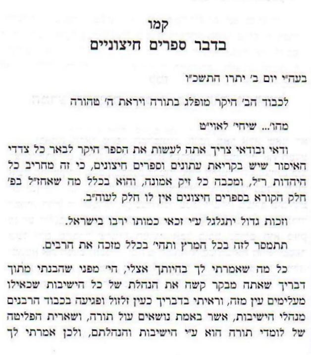 ערכתי לאחרונה בתאריך 19.07.13 בשעה בברכה, על התורה ועל לדעתי גם המכתב דלהלן היה ראוי לעלות בלי הערות ותוספות, אולם לאחר הוצאת כוונת האשכול הקודם שלי מהקשרו, אני רואה צורך לבאר את המסר שע"פ דעתי עולה מהמכתב הנ"ל....ע"פ הנראה, מכתב זה נשלח לבחור שהגיע למרן הסטייפלר זצוק"ל, כאשר הוא מעלה רעיון להוציא ספר בעניין חומר האיסור של "ספרים החיצוניים", כאשר לדעתו הנגע פשה בעולם הישיבות, וראשי הישיבות לא עושים די בכדי למנוע את התופעה החמורה. ע"פ הנראה מהמכתב, כשהגיע אל מרן הסטייפלר, הוא נזף בו על כך שהוא מטיף מוסר לראשי הישיבות, אשר אינם עושים די בכדי למנוע את התופעה הקלוקלת.... לאחר מכן שלח לו מכתב, שלא ירד מהרעיון, ושאכן ב"בין הזמנים" יערוך ספר על חומרת העניין.... וכל מה שאמר לו היה רק בגלל שהוא הטיף מוסר לראשי הישיבות שלא עושים די להלחם בספרים החיצוניים הנפוצים בישיבות...