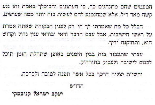 כך זה מי שמרגיש את עצמו על התורה... לקורא הפשוט מבואר, שהבחור הציע להוציא ספר תוך כדי שנשמע מדבריו נימת ביקורת על ראשי הישיבות שאינם עושים דיים. הסטייפלר הגיב על כך כמו שכתוב במכתב, שהמצב קשה מאד ואין מה לעשות.. במכתב ההבהרה הסביר שאמר זאת כיוון שהרגיש צורך להצדיק את ראשי הישיבות, אך לגופו של דבר אכן עליו לפעול ולהוציא ספר וכו'. לא מופיע בשום מקום שהוא נזף בו. נ.ב. על עצם הדבר אינני חולק, ובוודאי שיש צורך לשמור על כבודם של ראשי הישיבות גם אם אינם עושים את מה שיכולים לעשות כראוי. (וכפי שהסטייפלר שמר על כבודם גם כשבעצם הסכים לעצם הביקורת) |