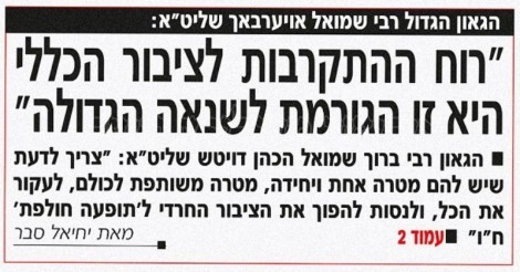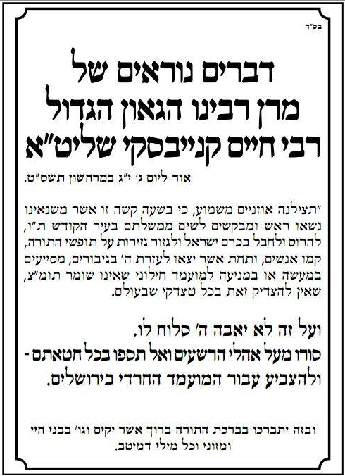 ערכתי לאחרונה בתאריך 19.11.13 בשעה בברכה, על-הסלע-הך כל הרעות החולות שתוולדנה על ידי ראש העיר החילוני ברקת תזקף באשמת אלו שבשם השנאה לכל היקר והקדוש מנעו את הצגת מועמדותו של ר' אורי לופוליאנסקי, ותחת זאת בחרו לבחור במועמד משוקץ המייצג מפלגה משוקצת כליאון.וכך גם לא התביישו לבחור בליאון במקום המועמד החרדי היחיד ר' חיים אפשטיין הי"ו. כעת אין ברירה אלא לנסות להציל ככל הניתן. ואותם צבועים ושאולזונים מעיזים לגלגל עיניים צדקניות ולהטיף מוסר לבני התורה..  |