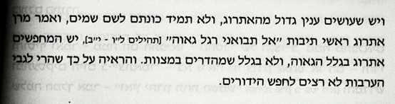| ומצטט את פירוש רש"י ש"קיתון של מים" הכוונה "למי שאין לו יין". ואז הוא צוחק ומסביר: "רש"י היה גר בצרפת. צרפת המנהג שם עד היום הוא שהם מלאים ביין, מלא ביין. והגויים שותים שמפניה.." (צחוק ענק בקהל), "אני יודע, אני גרתי תקופה קצרה בשווייץ בחלק הצרפתי, אז שמה איפה שעשו את היין היו תיכף ומיד קוטפים את הענבים, קוטפים, שמים אותם בחבית, ותיכף היו בוצרים, ככה בלי שום בעיה. ותיכף היה יין. והיו עושים עם הרגלים עם הרגלים, באים עם הנעליים, פושטים את הנעליים, יושבים בתוך החבית, דורכים בתוך הענבים, ותיכף היה יין". ציטוט מאת: עוד יש לומר | https://rotter.name/kolot/prime/50596.php |