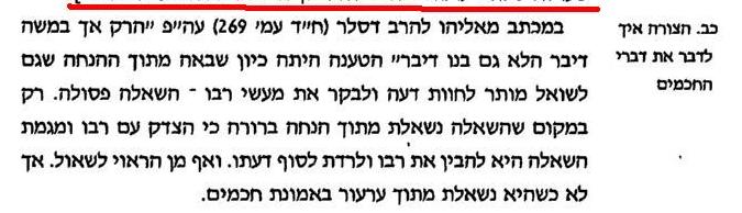 על כן לדעתי רבים מן הניצים משני הצדדים כאן עברו את גבול הטעם הטוב. מחד גיסא ישנם המביאים דברים מגדו"י באופן שקובע נחרצות כאילו הרב הוא משכיל ומסלף את התורה. עפ"ל. ומאידך ישנם הרואים בכל מי שמקשה על דברי רבם כאפיקורוס ומבזה תלמידי חכמים. וזו טפשות. הדרך הנכונה לדעתי היא, לדון באמת בדברי הרב, אך באותה יראת כבוד שאנו דנים בחזון איש ובקצות תמוהים. וכן אפשר להסיק מסקנות בסוגיית "עשה לך רב" עפ"י דבריהם ותורתם של גדו"י. ובהזדמנות זו אמחה מחאה נמרצת בחברי שדיברו בזלזול מחפיר כלפי גדו"י.