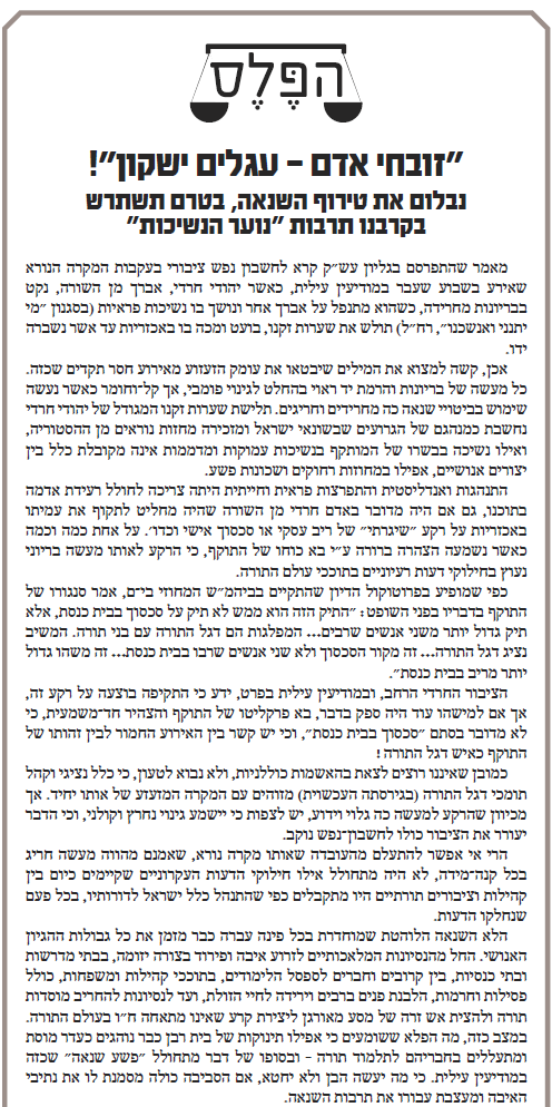מאמר שהתפרסם בגליון עש"ק קרא לחשבון נפש ציבורי בעקבות המקרה הנורא שאירע בשבוע שעבר במודיעין עילית, כאשר יהודי חרדי, אברך מן השורה, נקט בבריונות מחרידה, כשהוא מתנפל על אברך אחר ונושך בו נשיכות פראיות (בסגנון "מי יתנני ואנשכנו", רח"ל) תולש את שערות זקנו, בועט ומכה בו באכזריות עד אשר נשברה ידו.