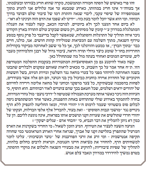 התנהגות ואנדליסטית והתפרצות פראית וחייתית היתה צריכה לחולל רעידת אדמה בתוכנו, גם אם היה מדובר באדם חרדי מן השורה שהיה מחליט לתקוף את עמיתו באכזריות על רקע "שיגרתי" של ריב עסקי או סכסוך אישי וכדו'. על אחת כמה וכמה כאשר נשמעה הצהרה ברורה ע"י בא כוחו של התוקף, כי הרקע לאותו מעשה בריוני נעוץ בחילוקי דעות רעיוניים בתוככי עולם התורה.