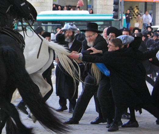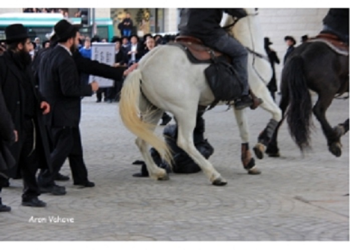 ת"ח אחד אמר על כך השבוע, כי מכאיב לראות שאותם עסקנים ולבלרים שתבעו בשנה האחרונה להיזהר מפני כל צעדי מחאה נגד השלטון וגזירת הגיוס, בשל חששות חינוכיים של החדרת אוירה כוחנית כביכול בין בני הנוער, הם הם אלה אשר מעודדים, לפחות בהסכמה שבשתיקה, כל צעד מרפקני וכוחני של מחאה אלימה וירידה לחייהם של יהודים יראים ושלמים, שכל חטאם בכך שהם צועדים לאור רבותיהם. הוא הוסיף, כי העיוות הזה ניכר כאשר אותה מערכת תעמולה שמטיפה ל"דרכי נועם" מול גוזרי הגזירות, בחרה להתמקד באירוע שולי שהתרחש באחת ההפגנות, כאשר אחד המשתתפים ניסה לבלום סוס משטרתי שעמד לרמוס ח"ו יהודי חרדי, ומאז החליטה להנפיק ללא הרף גינויים נגד "מושכי זנבות הסוסים" – זאת בעוד, להבדיל אלף אלפי הבדלות, זעקתו של יהודי חרדי שתולשים את שערות זקנו ונושכים אותו בפראות, אינה נוגעת לליבם. הן על כגון דא ניתן להמליץ את דבר הנביא, כי "זובחי אדם – עגלים ישקון"!