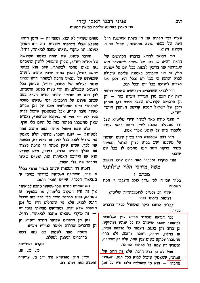 ברור שהציפיה היא חלק מהאמונה, אבל רק חלק... כתוב מפורש ברמב"ם שיש "אינו מאמין" - כלל בענין ביאת המשיח, ויש "אינו מחכה" - שמאמין בפרט מסוים ולא מאמין בפרט אחר, שמאמין שיבוא משיח ולא מאמין שיכול לבוא בזמן פלוני. וזה בדיוק מה שאמר הגרמ"צ, "ברמב"ם כתוב שצריך לחכות לביאת המשיח, חוץ ממה שצריך להאמין להאמין בו ולהיות 'מאמין בביאתו' צריך גם להיות 'מחכה לביאתו'". - להאמין בביאתו זה להאמין בעצם ביאתו, ומחכה לביאתו זה להאמין שיכול לבוא בכל רגע וכו' וכו', כמקובל. אין כאן מילה וחצי מילה ששונה ממה שמקובל. גם הרמב"ם קרא לזה בלשון "לחכות", והוא בסה"כ ציטט את לשון הרמב"ם. אם אתה אומר "אני מאמין" כל יום, אתה משנה את הנוסח ואומר ואע"פ שיתמהמה "אאמין שיכול לבוא בכל יום"? אתה אומר "אחכה לו", כלשון הפסוק "אם יתמהמה חכה לו", וגם הרמב"ם כתב שצריך להיות "מחכה לביאתו". ועל ה"מחכה" הזה הגרמ"צ דיבר, הוא ציטט את הרמב"ם. |