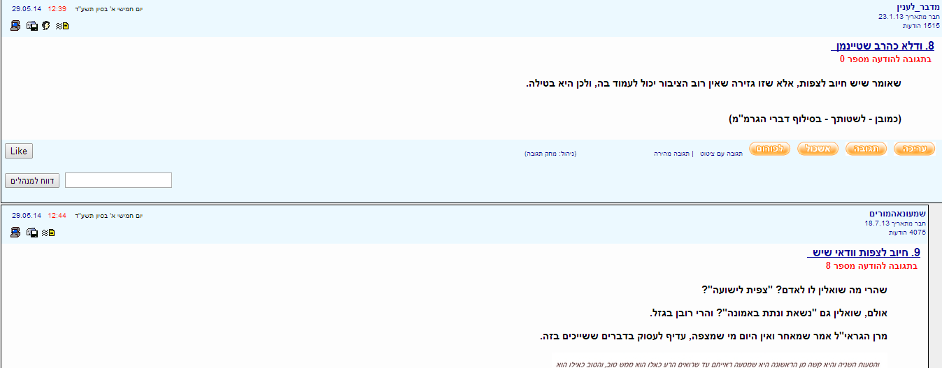 ערכתי לאחרונה בתאריך 29.05.14 בשעה בברכה, חכמתספריםתסרח תתרומם לראש העמוד במכתב הקודם , שכתב וז"ל: "הרי מבואר להדיא בדבריו קדושים של הח"ח זיע"א שהחיוב של 'צפית לישועה' הוא ש"בודאי אנו צריכין לצפות בכל יום על ישועת ה'" (-בביאת משיחו), כי אנו מאמינים באמונה שלמה שיכולה לבוא ישועת ה' בכל יום ובכל רגע, ולכן אנו מצפים לישועה בכל יום ובכל רגע." .. ומסיים שהן הן דברי הגרי"ז שלימד בזה דעת את העם וכו'. רק במכתב לאחמ"כ בא לאפוקי מדברי שטות שכביכול צריך לפנות דעתו מכל דבר ולהגות רק בזה, שאם כן כל עבודת השם בתורה וביהדות בטלה (ולא היה יכול לצאת ולגדול הגרמ"צ...), אלא ע"כ הגדר הוא כמו שמסיים וז"ל :" אלא שאם תשאל אותו: האם אתה מחכה למשיח? - יענה ויאמר: בודאי , הלא מאמין אני שיכול לבוא בכל רגע, גם ברגע זה, ומחכה אני לכך (-ולא כן אמר ה"ש...) , אעפ"י שאין אמונה זו גורמת לעצור את מהלך החיים הרגיל, כמובן , אלא שיודע הוא את הידיעה האמיתית הזו ואע"פ שאינו מהרהר בה בלא הפסק"... ואינו סותר ואף אינו עניין כלל לדברי הגרמ"צ , שכן אפשר ל"ארוב ולשקוד" כלשונו , אף בלא הרהור והגייה תמידית בזה (ואם יעשה כן - תישוף דעתיה מדוכתה...), ולכן אמרו ז"ל ד"משיח בא בהיסח הדעת" , ע"ש, והגדר בדברים כנ"ל,ודוק. ויסכר פי דוברי שטות והבל. ..."כי אין אסון לחרדים יותר מעסקניהם וח"כיהם הנוכלים והפושעים - בעצמם... משום שהם גורמים להם במחדל ובמעש את כל האסונות בגשמיות ורוחניות מדיור ועד גיוס... וביודעי קאמינא! "...