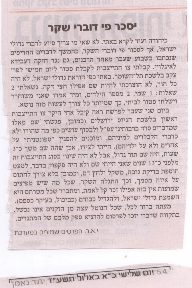 כיצד מעלים בדעתם אני יתד לתת לציבור מידע בענין באמצעות מכתב פשקווחלי בעילום שם במודר מכתבים למערכת שהוא כאמור גם שקרי כפי שהוכח ומלא במילות גנאי כלפי מאות רבנים שהתכנסו בשבוע שעבר כשהוא מציג אותם כרודפי שלמונים מחפשי כבוד ומתגרים....