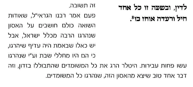 הרב טייכטל, שהיה עד השואה בעל השקפת עולם חרדית אנטי-ציונית, שינה בשואה את דעותיו מן הקצה אל הקצה. בספר זה הוא פורש את השקפת עולמו כפי שהתחדשה לו, ואת הסיבות שבגינן החל לתמוך ביישוב הארץ, ומבסס את דבריו על אלפי מובאות וציטוטים. בין השאר מובאת בספר ביקורת על הרבנים שעזבו את קהילותיהם בשואה וברחו למקומות מפלט. אני לא יודע אם אתה יודע אך אותם רבנים שהפקירו את צאן מרעיתם לשרפה השתמשו לבריחה בסרטיפיקטים של הציונים. כאשר הם יכלו להציל את חסידיהם אם היו אומרים להם לברוח אך אמרו שלא להאזין לציונים, ולהישאר במקומם.