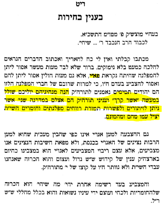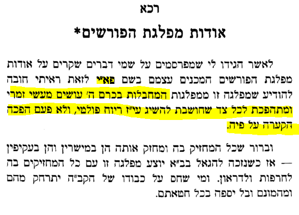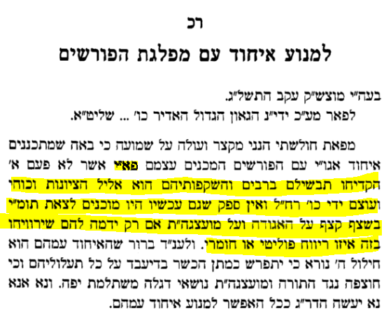 הוא בשל אי ציות לגדולי ישראל. אך בטרם אחל, אבהיר, כי במקרה דנן, מי אם לא בני התורה יחליטו מי הוא בעיניהם גדולי הדור אשל לאורם נלך. עצם ההתרסה על אי ציותם לגדולי ישראל, היא חוצפה מאין כמותה. הציות הזה מחייב לדבוק בערכיהם ובמורשתם ובממשיכי דרכם גם לאחר פטירתם. ואין לך פריקת עול גדולי תורה גדול יותר מאימוץ הנהגה שסותרת במהותה את כל מה שקיבלנו מרבותינו. כי זאת התורה לא תהא מוחלפת ! (בפרטים יתכנו הבדלים, אך לא ברוח הכללי) מה עוד שמרן הגר"ש שליט"א הוא הוא התלמיד חכם והירא שמים ובעל המדות ועובד ה' בקדושה ובטהרה והחכימא דיהודאי הגדול ביותר הנמצא בדורנו דור יתום זה. ולגופו של נידון על מה יצא הקצף של גדולי ישראל זצוק"ל כנגד פא"י, אדגיש בזאת כי העיקר הוא מה שהחומריות ושיקולי הפוליטיקא גברו אצלם במדה נכרת עד שבשל כך הסכימו לעשות פשרות ביהדות. להלן כמה ציטוטים מדברי בעל הקהילות יעקב, שנימק היטב מדוע המלחמה הגדולה כנגד פא"י. (מה שאומר שכת הפשרנים הם הם הפא"יניקים האמיתיים של דורנו). * * *
