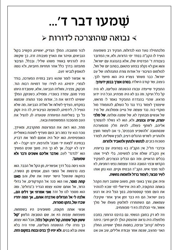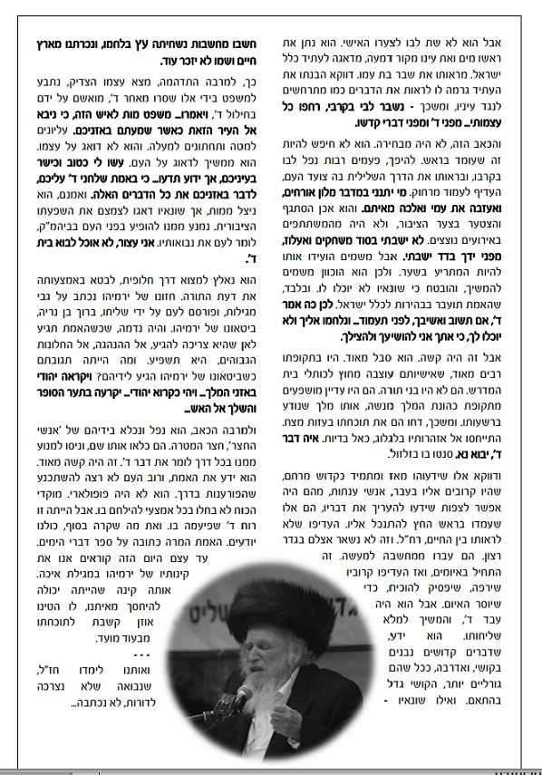 ''הפובליציסט של העיתון'' - אה ! איזה משפט ותואר נשגב המקפל בתוכו תובנות עמוקות, ידיעות נרחבות, ומהלכים שאין להם התחלה וסוף במטרה לכוון לדעתם של גדוילים שחיים עמנו ואשר נסתלקו משכבר... אכן, לכתוב מאמרי השקפה דורש יכולות ואיכויות נדירות... כך עם הרספקט המתבקש והכבוד הגדול לשלוח דרבנן ודידן נכנסנו בקומה שפופה בהכנעה ובחלישות כוח לשמוע דעה צרופה למה ועל מה ובמה צריך להתחזק... חשבתי לפרסם - לתועלת הרבים. תראו, פתח מכוון ההשקפה בטון נמוך שקט ורציני. האירוע ב... וב... וב... היה לאינם שומרי תורה - כך שברור למה זה קרה הם צריכים הרי להתקרב - זה ברור.. והפיגוע ב... וב... וב... אכן קרה ליהודים שומרי תורה ומצוות אבל הם אינם שומרים בתכלית ההידור הם צבעונים וד''ל - שוב הכל ברור כמין חומר.. הלא כך... וכבר הזהרנו בעיתון... וכמה פעמים... והאירוע ב...וב... וב... שאכן קרה לשחורים יותר סוף כל סוף הם אינם מן החוג שלנו הנעלים יותר המשובחים וקרובים וכו' וכו' - ואינם מנויים לעיתון שלנו ואינם מקפידים על הכשרנו דווקא - ואזי שוב הכול ברור ופשוט וקושיה מעיקרא ליתא - וכפי שכתבנו בעיתון יעו''ש והיטב ודו''ק - מאמר הנושא את הכותרת '' החיזוק בהשקפה בדרכי רבותינו דווקא הצריך חיזוק - כפי שמן השמיים מראים לנו'' זהו, מה נשאר כמה אירועים ודריסות ופיגועים ודקירות ובקבתי''ם ואבנים לאנ''ש ממש - עם כל ההידורים והחומרות אנשים הראויים לבא בקהל ממשיכי המסורת עם כל הרצינות המומחים להבחין בין קלא אילן לתכלת והמקפידים לציית להוראות העיתון - איך באה אליהם פתאום ? אכן קושיא ! נתנחם הוסיף הכותב שאת רוב המקרים הצלחנו להסביר.... חזרתי הביתה, פתחתי רדיו והקשבתי לפרשנות של אביגדור ליברמן. משהו בדבריו היה נראה לי רציני יותר... זיכני ה' והאזנתי לדברי רבנים אמתיים המפנים את האצבע לעצמנו לכל אחד ואחד - ''אבל אשמים אנחנו'' ''ולב יודע מרת נפשו'' נכתב לרגל המצב....