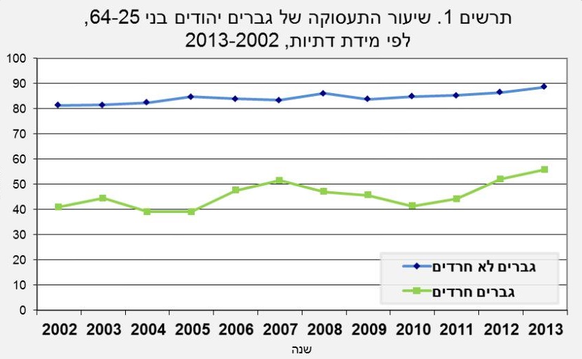 בקרב הנשים החרדיות, החל מ-2012 ניכר זינוק בשיעור התעסוקה והוא הגיע ל-68% בשנת 2013, לאחר שבשנים 2002-2011 הוא נע סביב 50%.