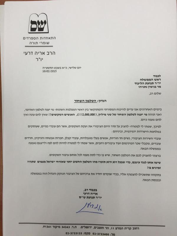 הטלפון נשלח עם הקדשה אישית לכל ראשי המפלגות