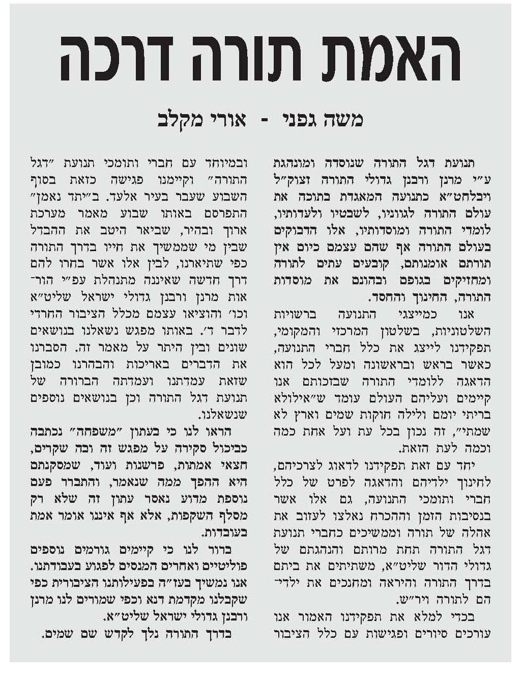בלי התנצלויות וגמגומים. חד וחלק! "אנחנו מייצגים בראש ובראשונה את לומדי התורה, אך דואגים ג"כ לצרכיו של מי שנאלץ לצאת לעבוד למחייתו" כמו"כ הוא תוקף את עיתון משפחה. ומצדיק את מאמרי יתד דאז (נתי גרוסמן) על החרדשי"ם