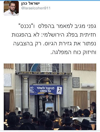 גפני המשיך: "העמדות של הבית היהודי הם אותם עמדות כמו של לפיד – מנהיגי דרכנו צריכים לבחור בין רשע יותר לרשע פחות לא שאנחנו צריכים לבחור את הטוב יותר. הם מסתכלים עכשיו רק על יהדות התורה האם אחרי הפגיעה בגיוס בכוללים ובישיבות הציבור החרדי אומר לא באופן מוחלט לגזירות ולגיוס ויש רק דרך אחת – בקלפי. אין דרך שאומרים אני מפגין ומעבר לזה אני לא עושה כלום! בכל דור ודור יש את השפה המדוברת והדרך היא בהגדלת הכוח החרדי.