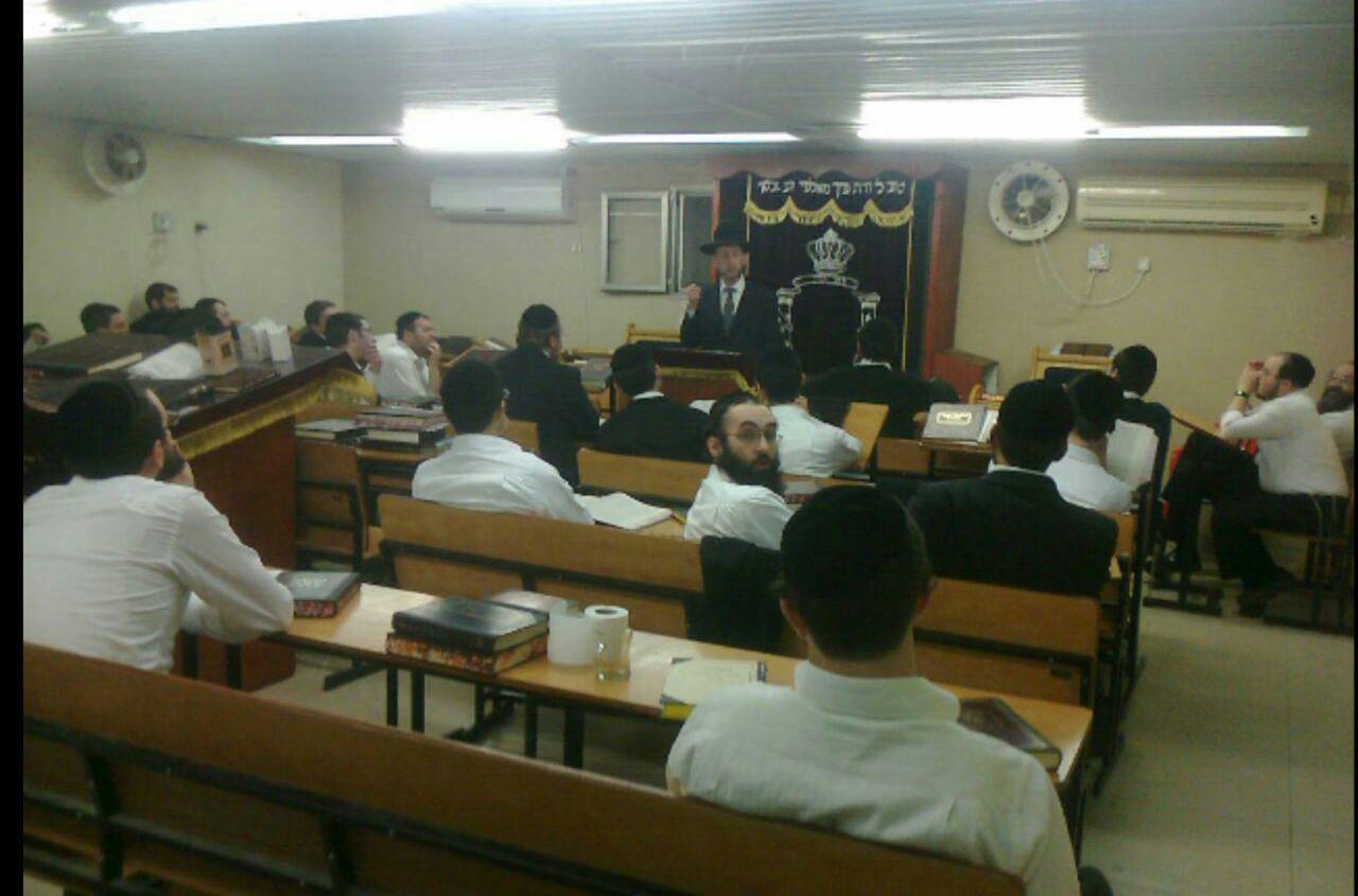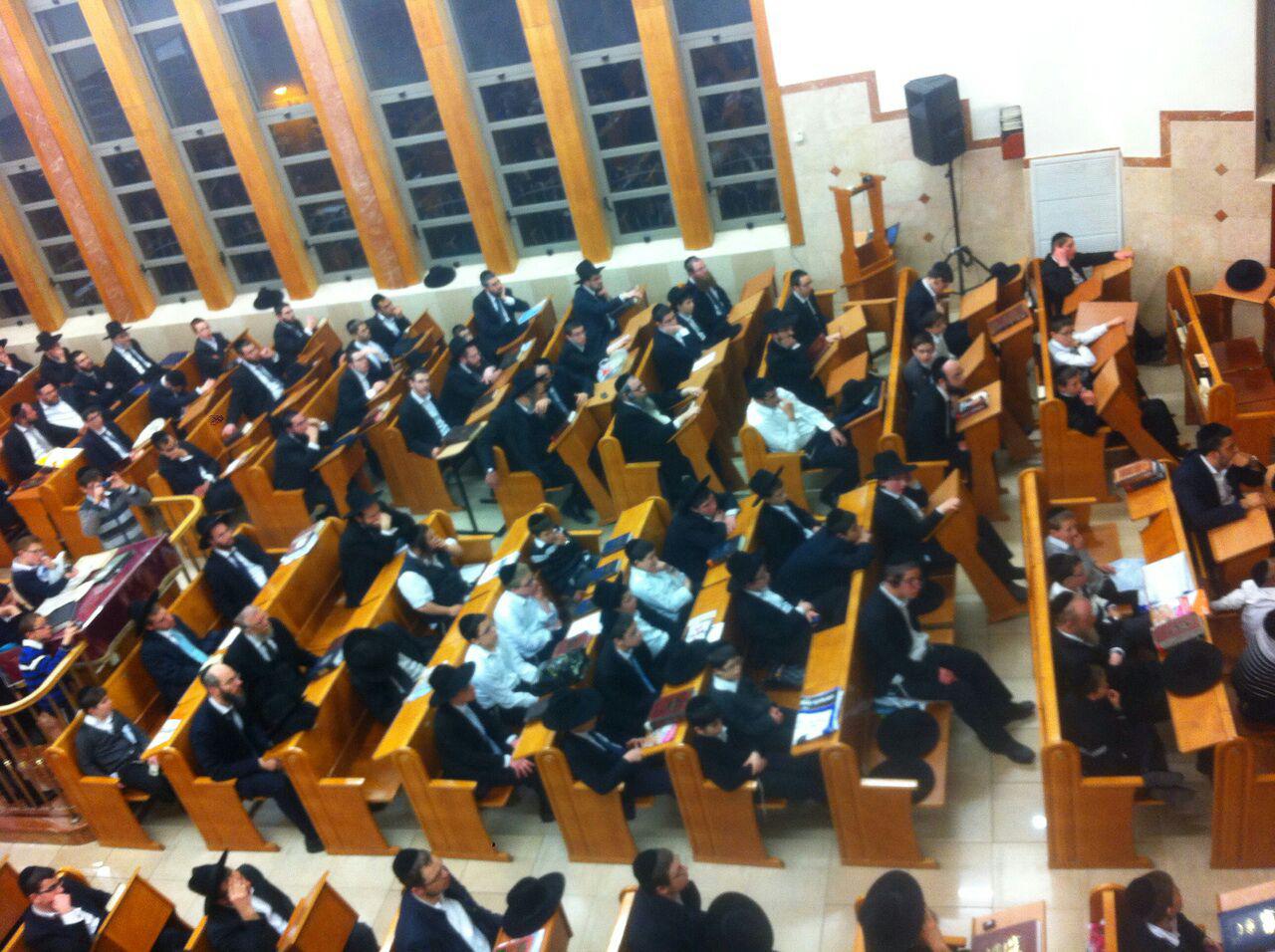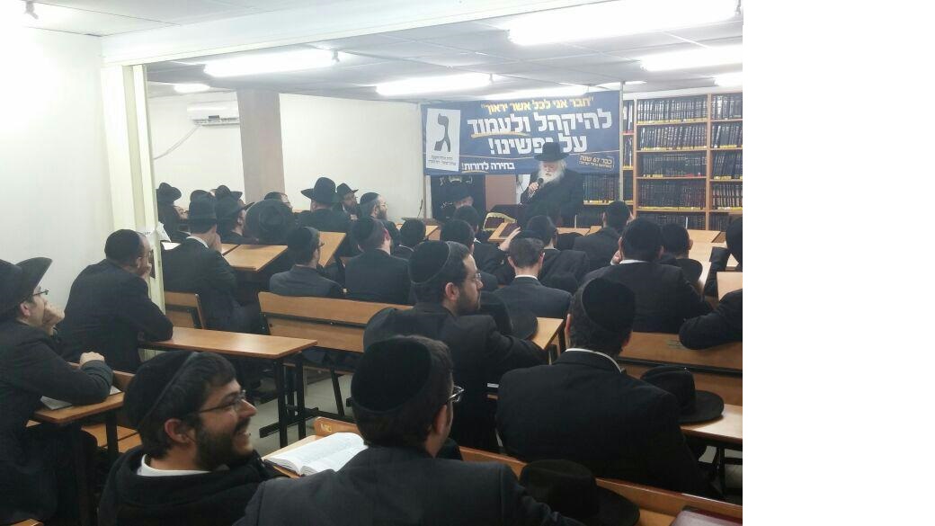 תמונה עם הרבנים הדוברים, מאזינים לגר"ד כהן כשמאחוריהם ספסלים ריקים. ובכניסה 10 עומדים.
