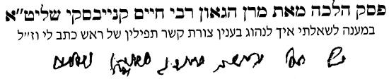 תשובה אותנטית בכתב ידו של מרן הגר"ח קניבסקי שליט"א נדפסה בקונטרס הלכתי שנדפס בחודשים האחרונים ואשר עוסק בשאלה הלכתית שנויה במחלוקת. מדובר בקונטרס 'פרי אליעזר' שמנסה להוכיח כי המנהג של קשר תפילין מרובע בתפילין של ראש, הוא המנהג הנכון שיסודו בדברי הפוסקים (ולא הקשר בצורת דלי"ת).