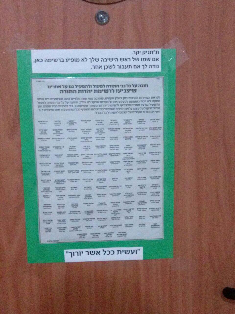 בכמה מהבתים נתלו שלטים בהם הודבקה המודעה ומעליה נכתב: "ת"תניק יקר, אם שמו של ראש הישיבה שלך לא מופיע ברשימה כאן, נודה לך אם תעבור לשכן אחר".