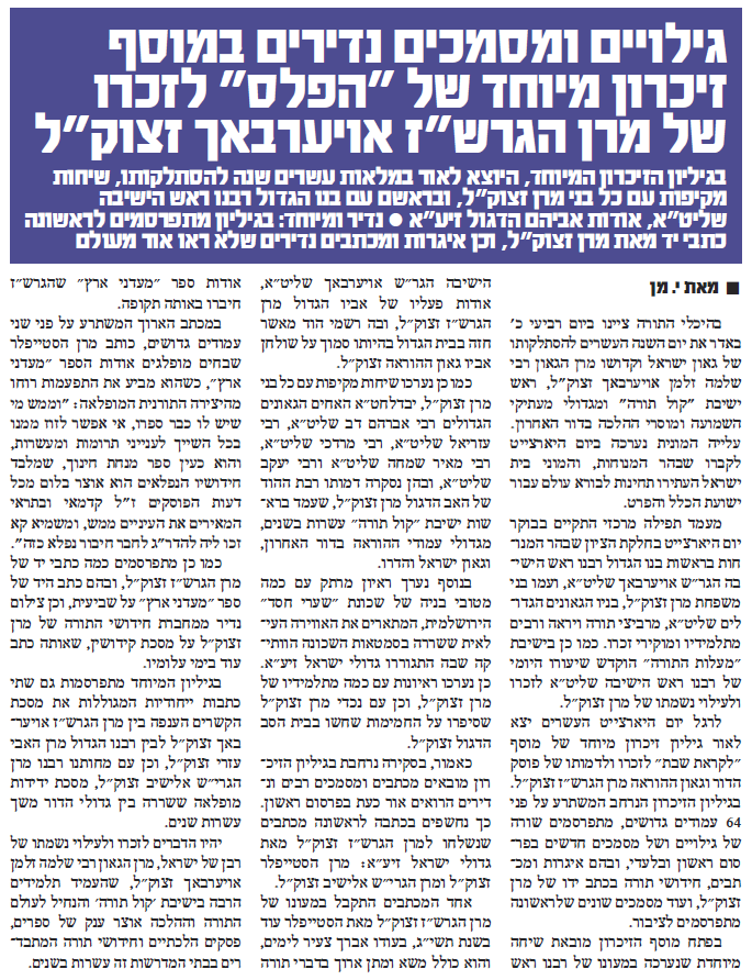 גילויים ומסמכים נדירים במוסף זכרון מיוחד של 'הפלס' למרן הגרש''ז אויערבאך זצוק''ל