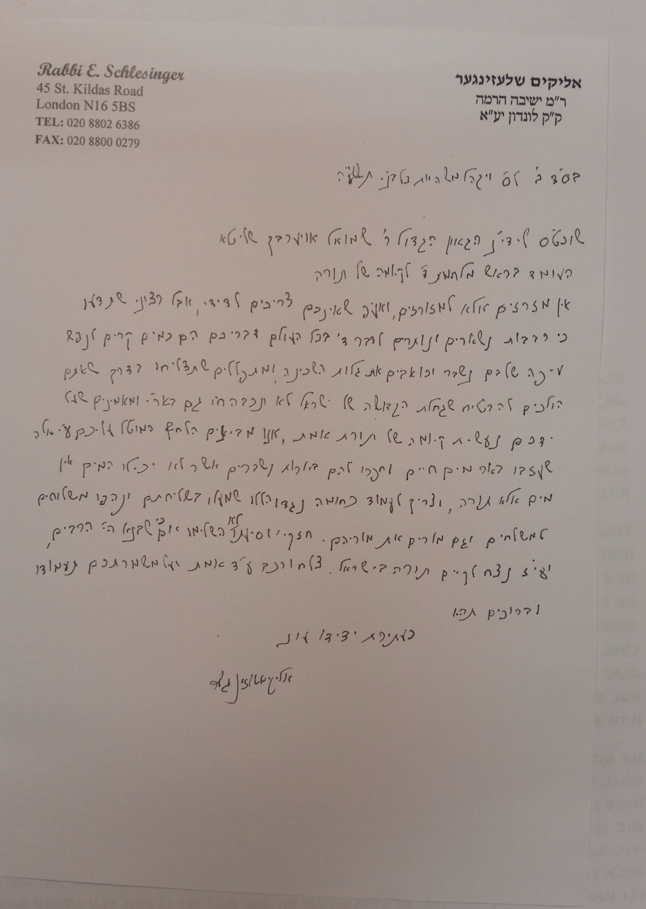 מכתבו של הגר''א שלזינגר שליט''א מלונדון למרן ראש הישיבה שליט''א: