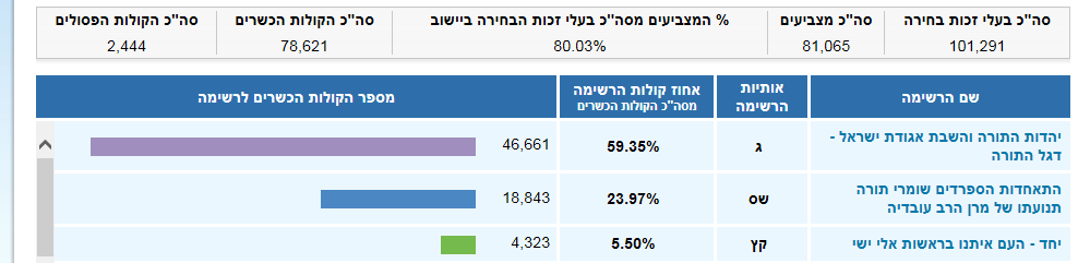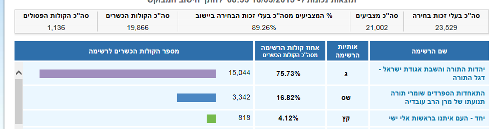 הפעם אחוז המצביעים ליהדות התורה עומד על 75.72% שזה 15044 קולות