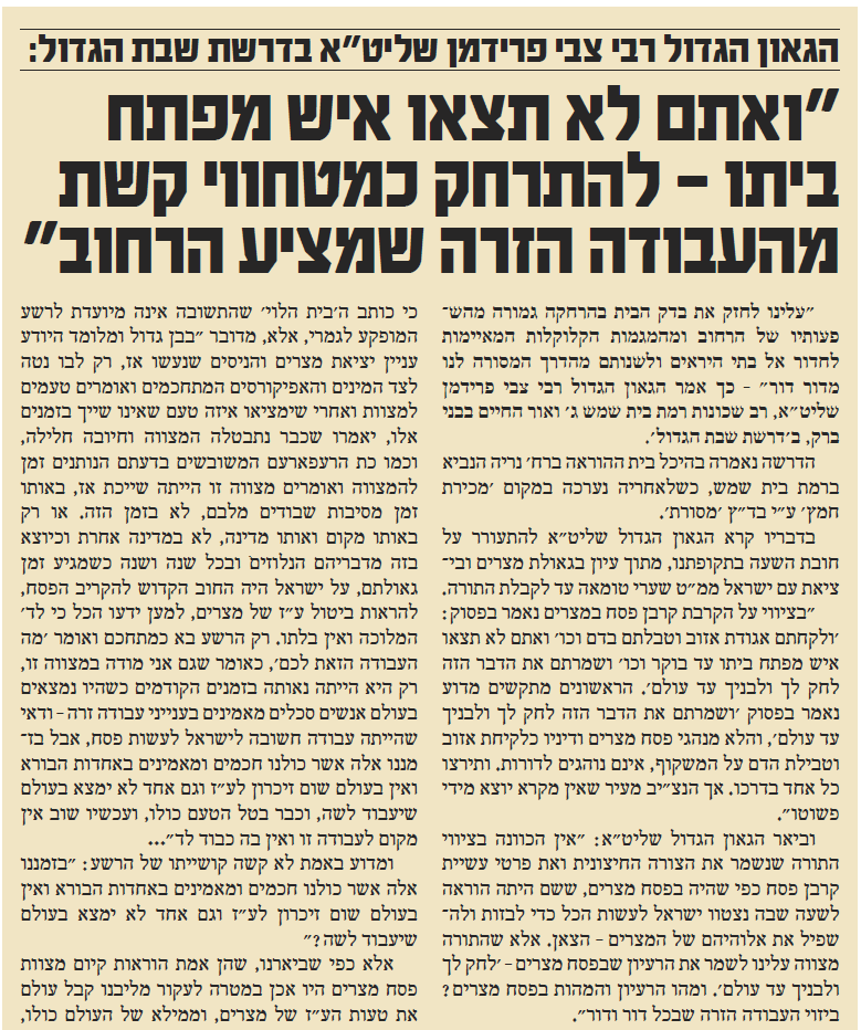הגר''צ פרידמן: ההתבצרות וההתרחקות מן החוץ - העצה להנצל מהשפעות זרות