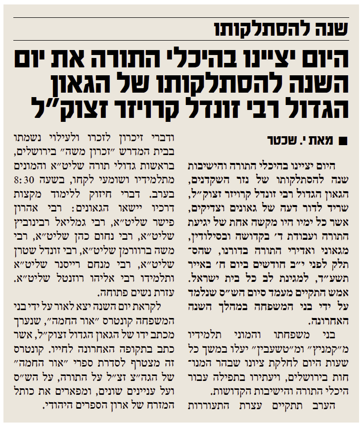 שנה להסתלקותו של הגאון הצדיק ר' זונדל קרויזר זצוק''ל בעל ''אור החמה''