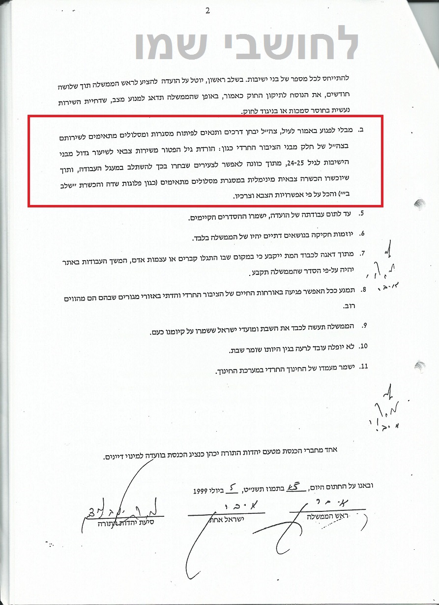 להסכם הקואליציוני של יהדות התורה ובהם נאמר בפירוש