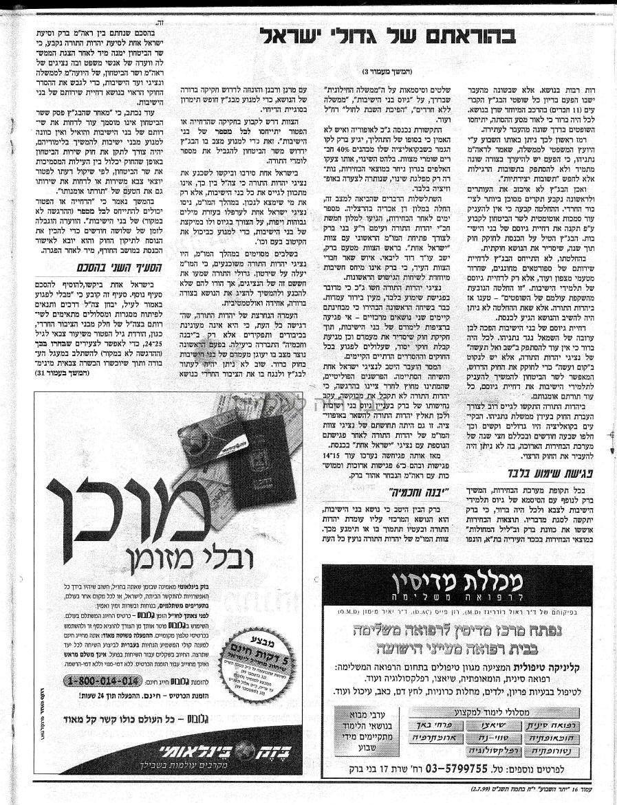 הוועדה הרוחנית דאז מר עזריאל מונק נמנעה הכנסת הכתבה,