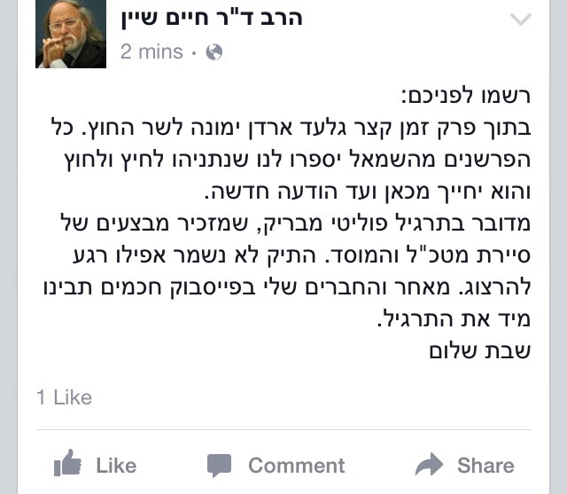 "באופן אישי, מדובר ביום מורכב מאוד עבורי ועבור חבריי הטובים המלווים אותי לכל אורך דרכי הפוליטית. החלטתי לא להצטרף לממשלה במתווה שהוצע לי. הסיבה: מהות.