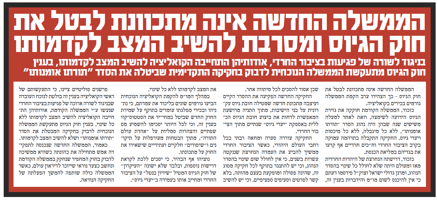 הרי מקובלנו מרבותינו, דור אחר דור מהגר"א ועד הרב שך, כי גזירת הגיוס תעמוד לנו עד ביאת גו"צ בב"א.
