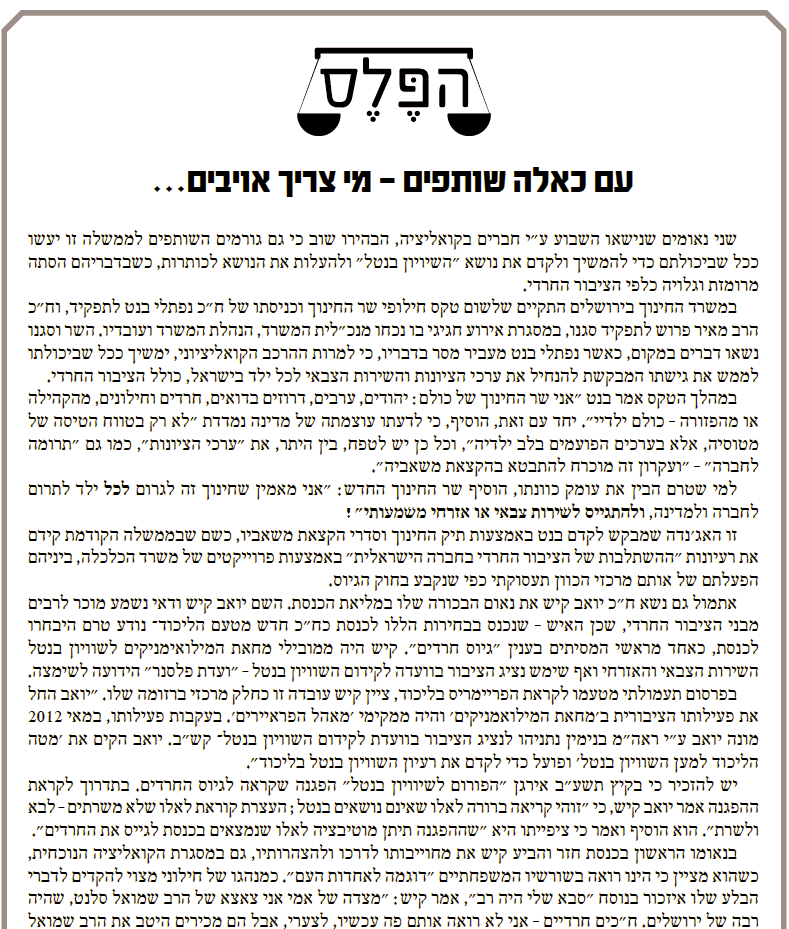 ''הפלס'' במאמר מערכת: חברי הקואליציה חושפים את עמדותיהם בענין 'השיוויון בנטל'