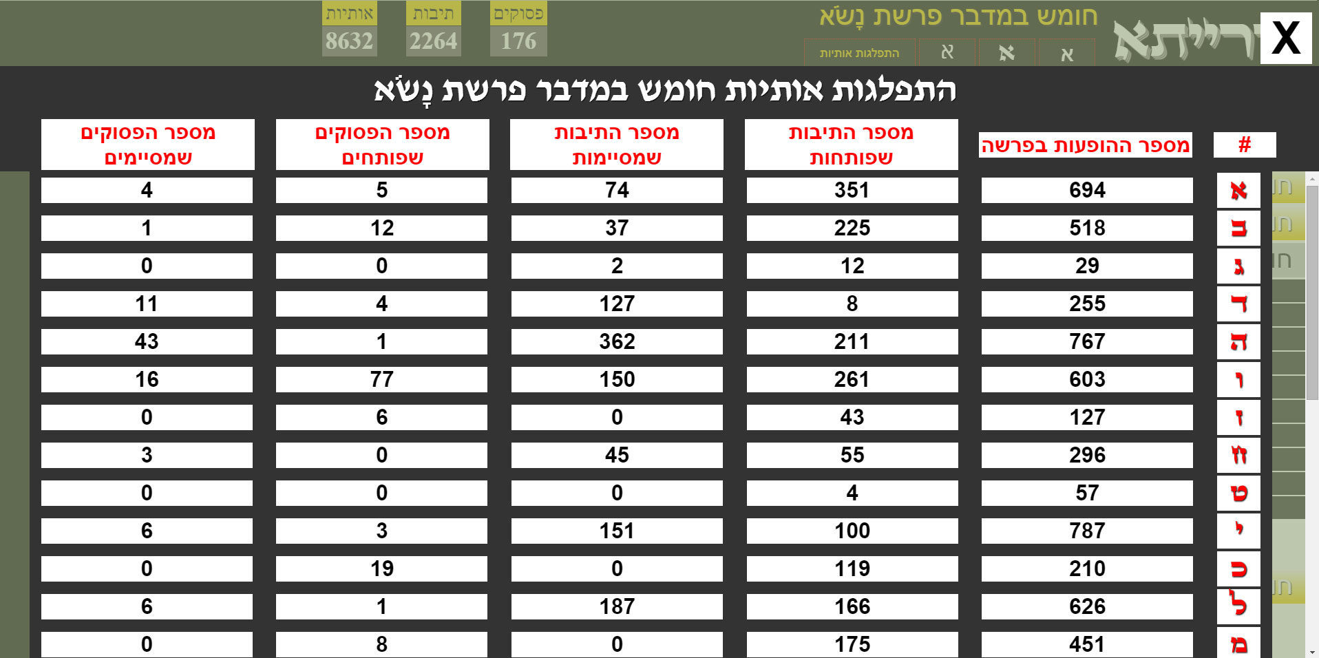 חומש בְּמִדְבַּר פרשת נָשֹׂא התפלגות אותיות בפרשה