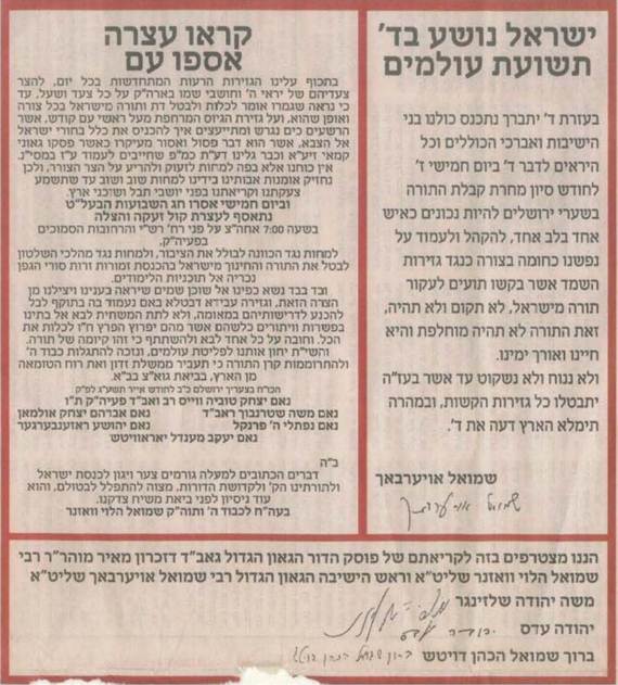 באיסרו חג שבועות תשע"ג, לקראת העברת חוק הגיוס בקריאה ראשונה התקיימה בירושלים עצרת ענק כנגר הגזירה, להלן קריאת גדולי ישראל להשתתף בעצרת: