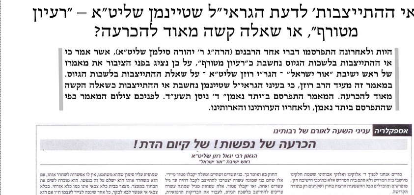 שימו לב לזה: כעת, לאחר שנחקק החוק, ונחתם ההסכם הקואליציוני עם 'יהדות התורה' שעשוי לבטל באופן סופי את הסנקציות הפליליות על תלמידי הישיבה, מורה מרן ראש הישיבה הגראי"ל שטיינמן להתייצב בלשכות הגיוס לקבלת דחייה או פטור.