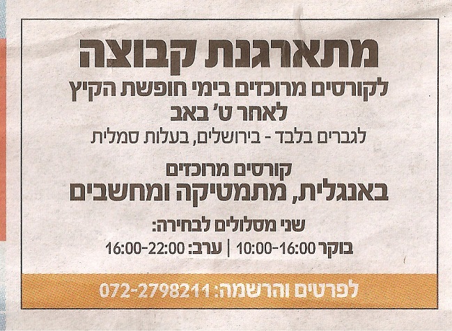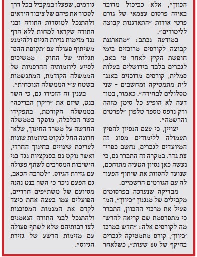 כהוכחה לדבריהם, מציגים אנשי 'הוועדה' מודעה שפורסמה ביום שלישי האחרון בעיתון 'יתד נאמן' – בה נכתב: "מתארגנת קבוצה לקורסים מרוכזים בימי חופשת הקיץ לאחר ט' באב לגברים בלבד בירושלים בעלות סמלית, קורסים מרוכזים באנגלית מתמטיקה ומחשבים… לפרטים והרשמה…"