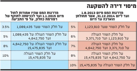 לגבי רכישת דירה להשקעה מיום 1.1.2015 ואילך, נקבע, כי יופחתו שיעורי מס הרכישה, ואלה יעמדו על 3.5% על חלק השווי שעד 1,089,435 שקל; 5% על חלק השווי העולה על 1,089,435 שקל ועד 4,642,750 שקל; על חלק השווי העולה על 4,642,750 שקל ועד 15,475,835 שקל - 8%; ועל חלק השווי העולה על 15,475,835 שקל - 10%.