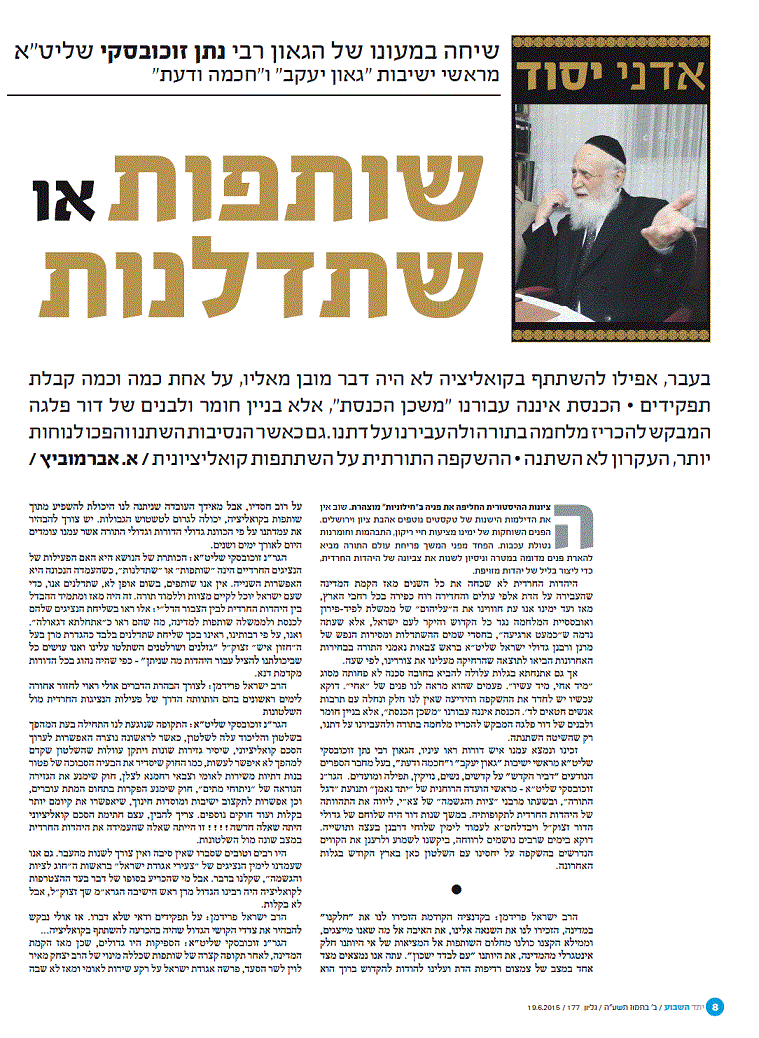 אבל נראה שבמערכת הביטאון השתרר חשש שהמסר העוין לציונים לא עבר מספיק ברור. לכן גוייס למשימה הרב נתן זוכובסקי, איש הועדות הרוחניות של דגל התורה ושל יתד נאמן. הועדות הרוחניות הן מעין הדור הצעיר והעתודה של מועצת גדולי התורה (לא להתבלבל. דור צעיר בהקשר הזה אינו בגיל של סתיו שפיר אלא רבנים שעוד לא הגיעו לגיל ממש מופלג). רבני הועדות הרוחניות משמשים בין היתר כצינור קשר הבין חברי הכנסת לגדולי התורה.