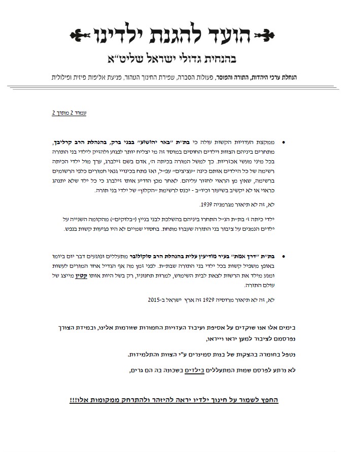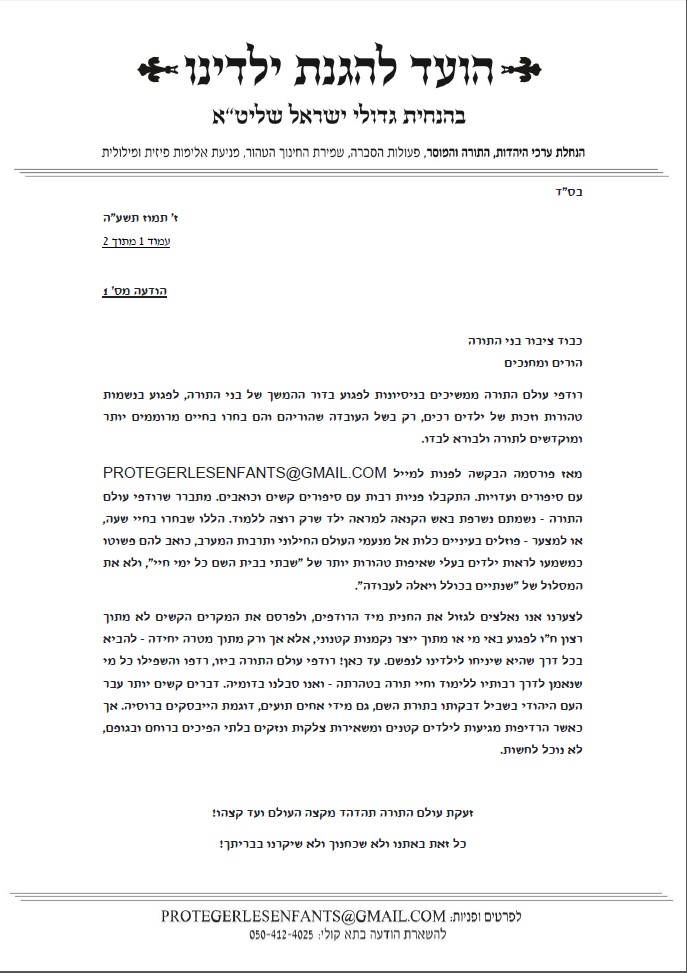 הוועד להגנת ילדינו - הודעה מספר 1