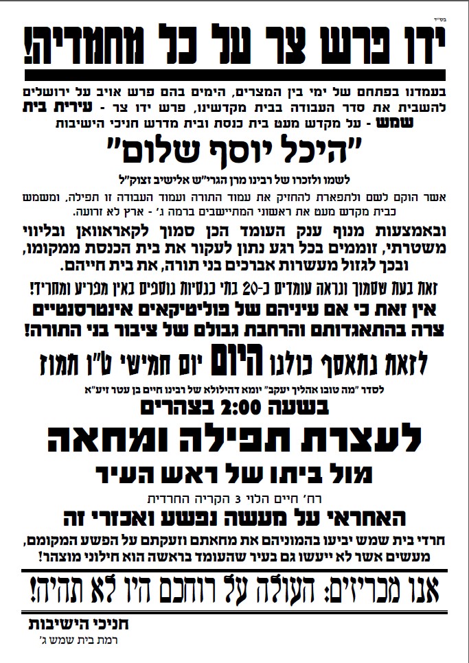 המאבק כנגד פינוי בית הכנסת 'היכל יוסף שלום' של הרב צבי פרידמן השוכן בקראוון ברמה ג' בבית שמש עולה שלב. בכוונת המתפללים לצאת ולמחות כנגד החלטת העירייה לפנות את המבנה בשל הצבתו הלא חוקית.