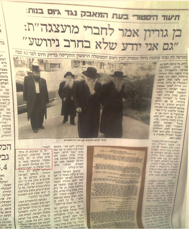 כבר היה לעולמים, היום לפני 62 שנה: לאחר פתיחה זו מסביר בן גוריון את עמדתו ומציין כי "אני יודע מרבנים שאינם אוסרים גיוס בנות ושרות לאומי והם בעד שרות לאומי".